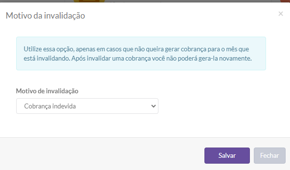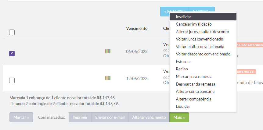 - Em seguida encontre a cobrança que deseja invalidar, selecione, clique em mais > invalidar;