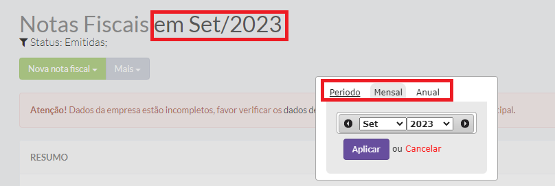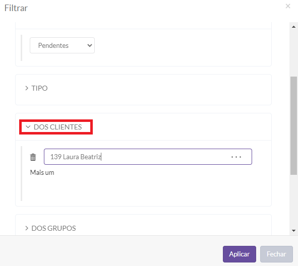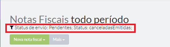 Perceberá que terá várias opções, como: status, tipo, dos clientes, dos serviços. Essas opções podem ser utilizadas conforme a necessidade. Nesta caso como queremos ter acesso as notas de um cliente em específico, iremos no campo "dos clientes" e localizar o cliente desejado e no "status de envio" vamos selecionar pendentes e clicar em "aplicar":