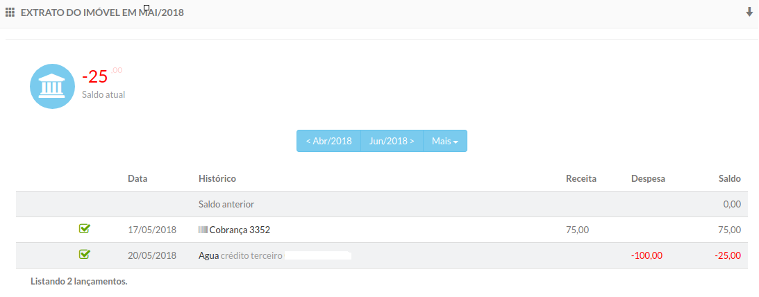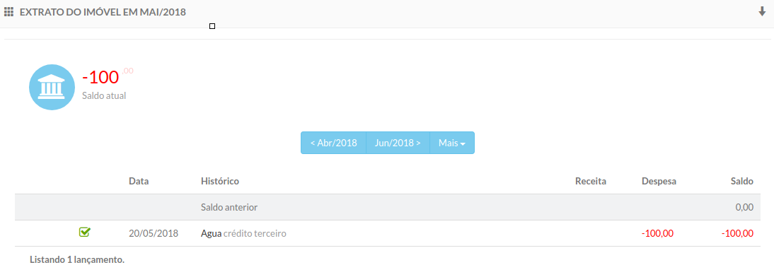 A partir do momento que essa despesa é liquidada o sistema computa esse valor na conta do imóvel registrando a movimentação e gravando o saldo negativo: