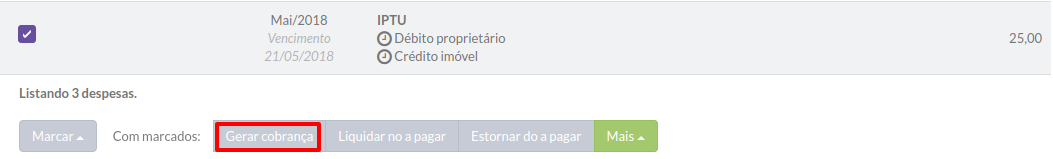 Existem casos onde é preciso cobrar essas despesas de alguém, que no caso seria o proprietário. Quando existem várias despesas e você precisa cobrá-las, basta selecioná-las e gerar uma cobrança para o proprietário: